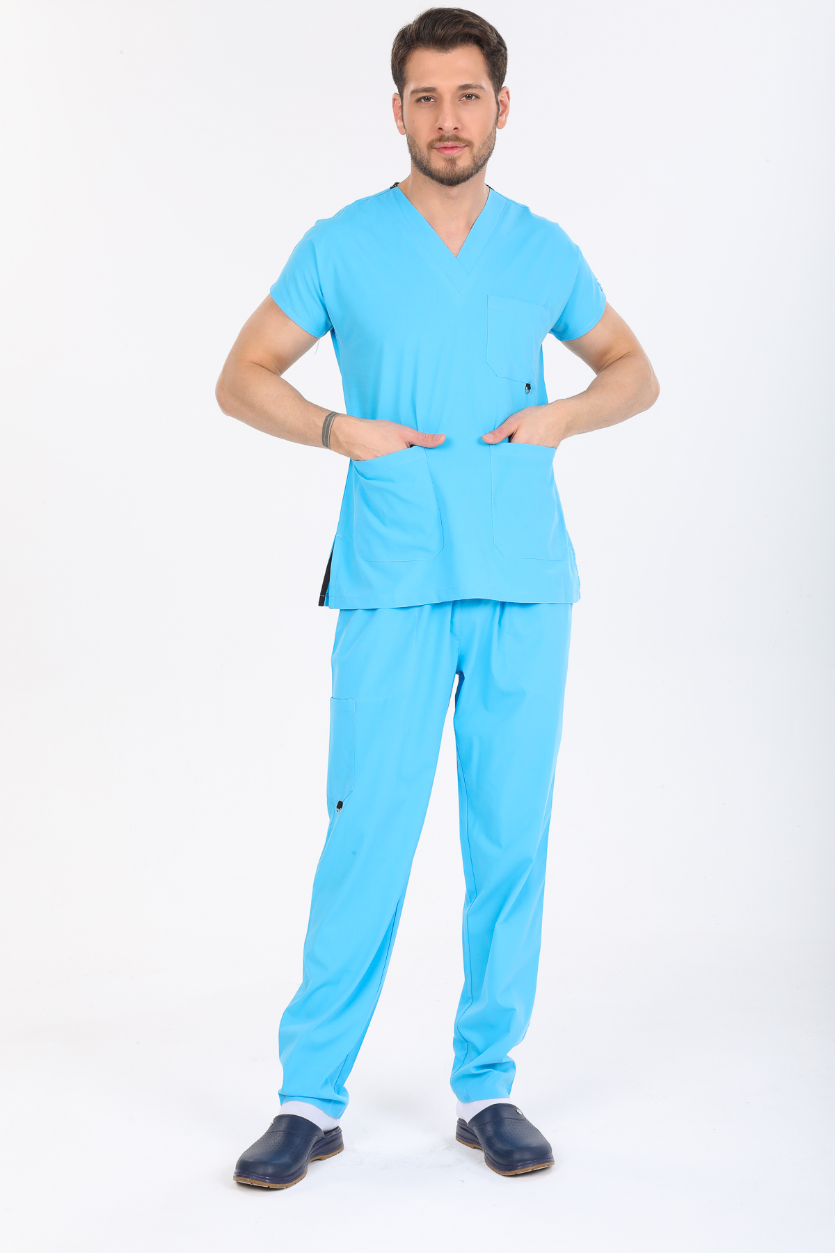 • V Cerrahi Yaka takımın kumaşının ince olması kapalı birimlerde ve yaz aylarında daha çok tercih edilmesini sağlamaktadır.